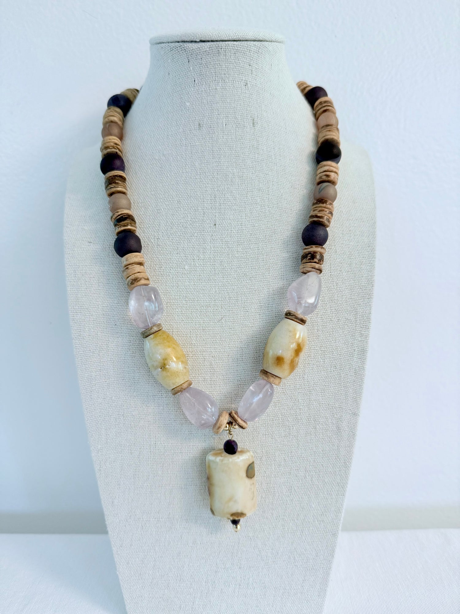Named for the Mayan goddess of the moon, love and textiles, the Ixchtel Necklace was inspired by a journey across Belize. Deep purple druzy agate and two styles of amethyst meet rustic coconut disks and hand-painted ceramics—grounding, beautiful, and rich with meaning. A piece that invites wisdom and wonder. Casual enough for a white t and jeans, polished enough to dress up.