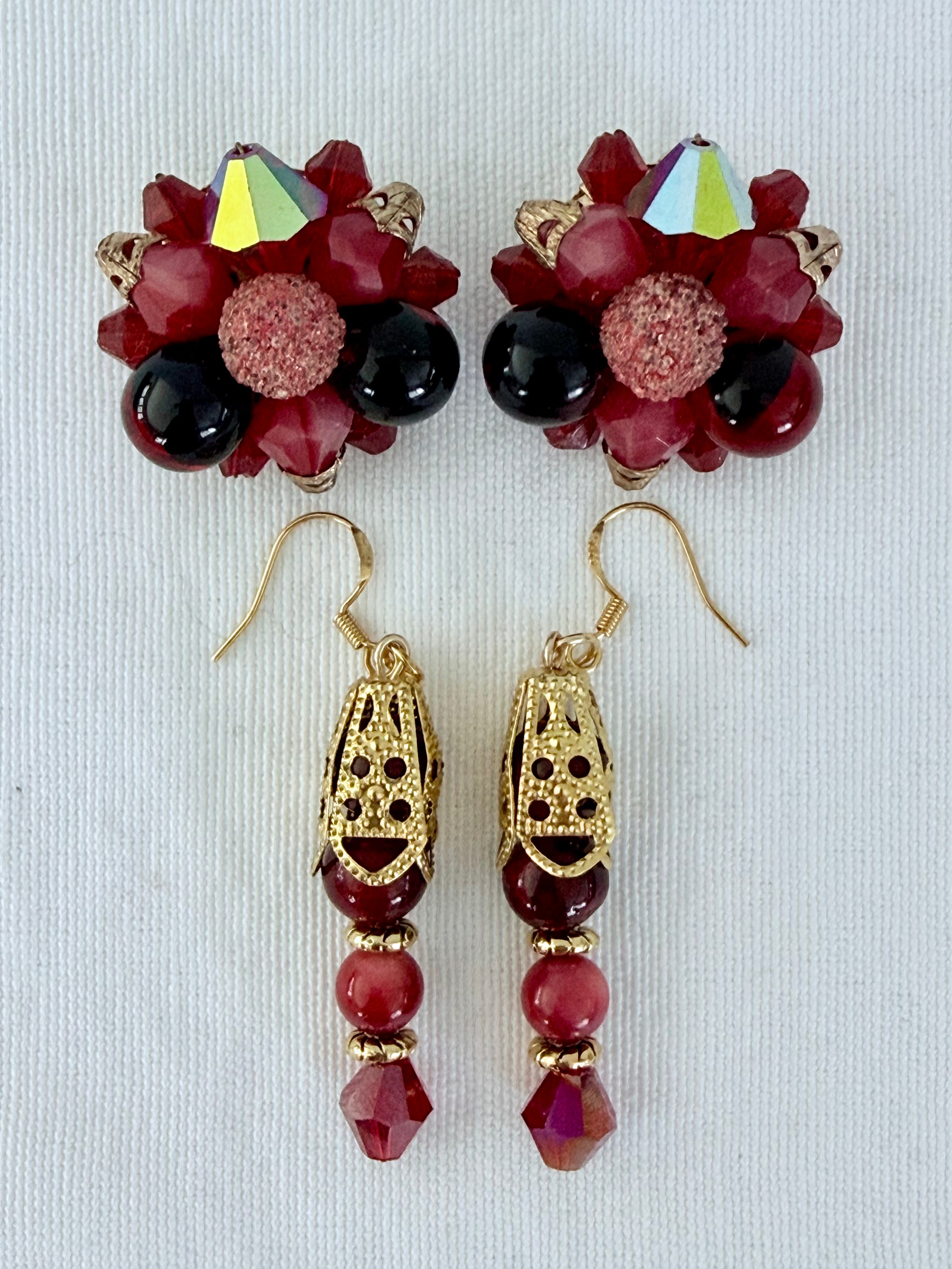 Drawing color cues from the necklace, the new earrings were built around red Preciosa crystal, pink-dyed shell, and red-and-black marbled agate — finished with a decorative gold cage and accents. Era-appropriate in feel, modern in execution. A worthy companion to a beautiful heirloom.