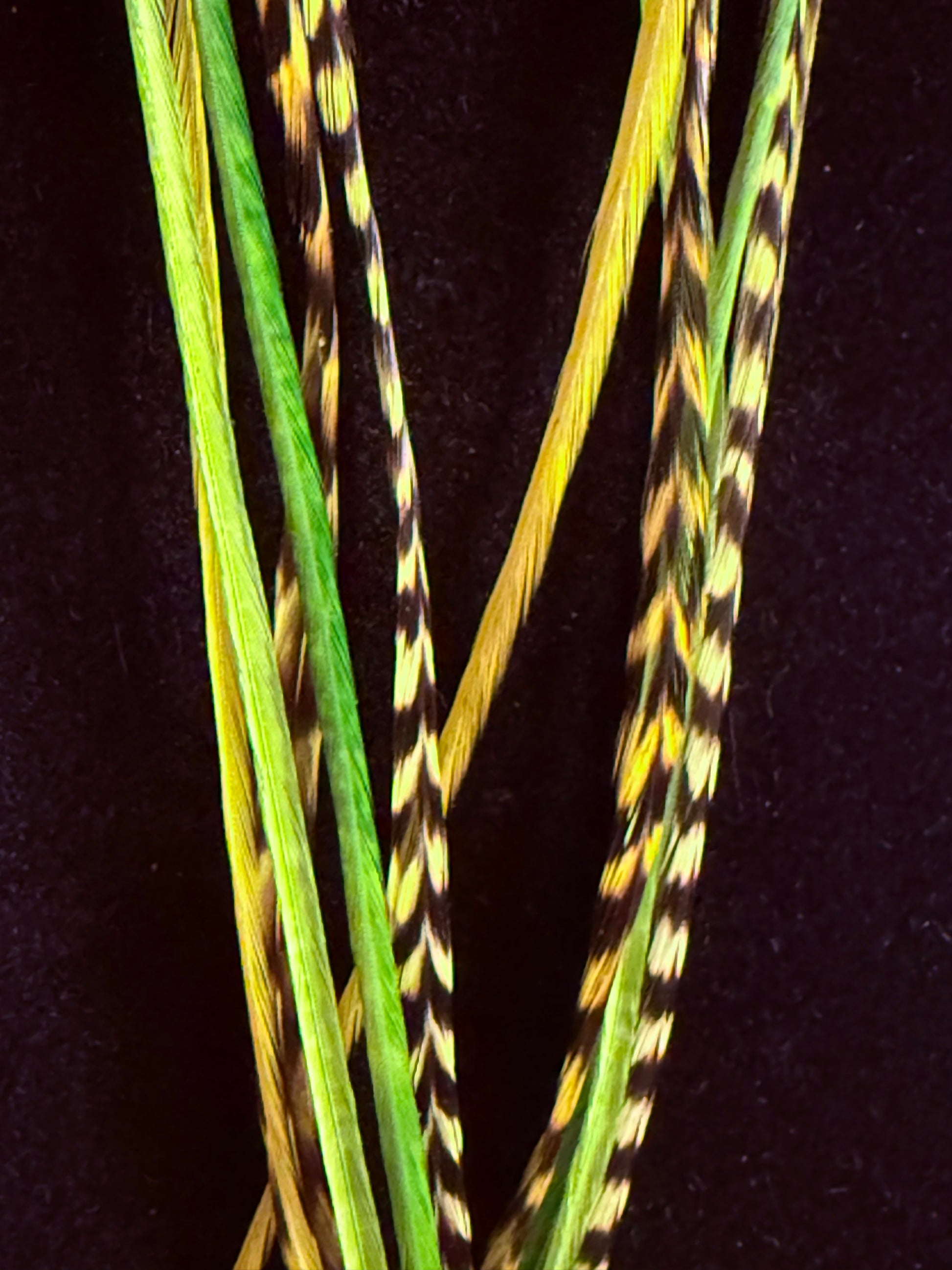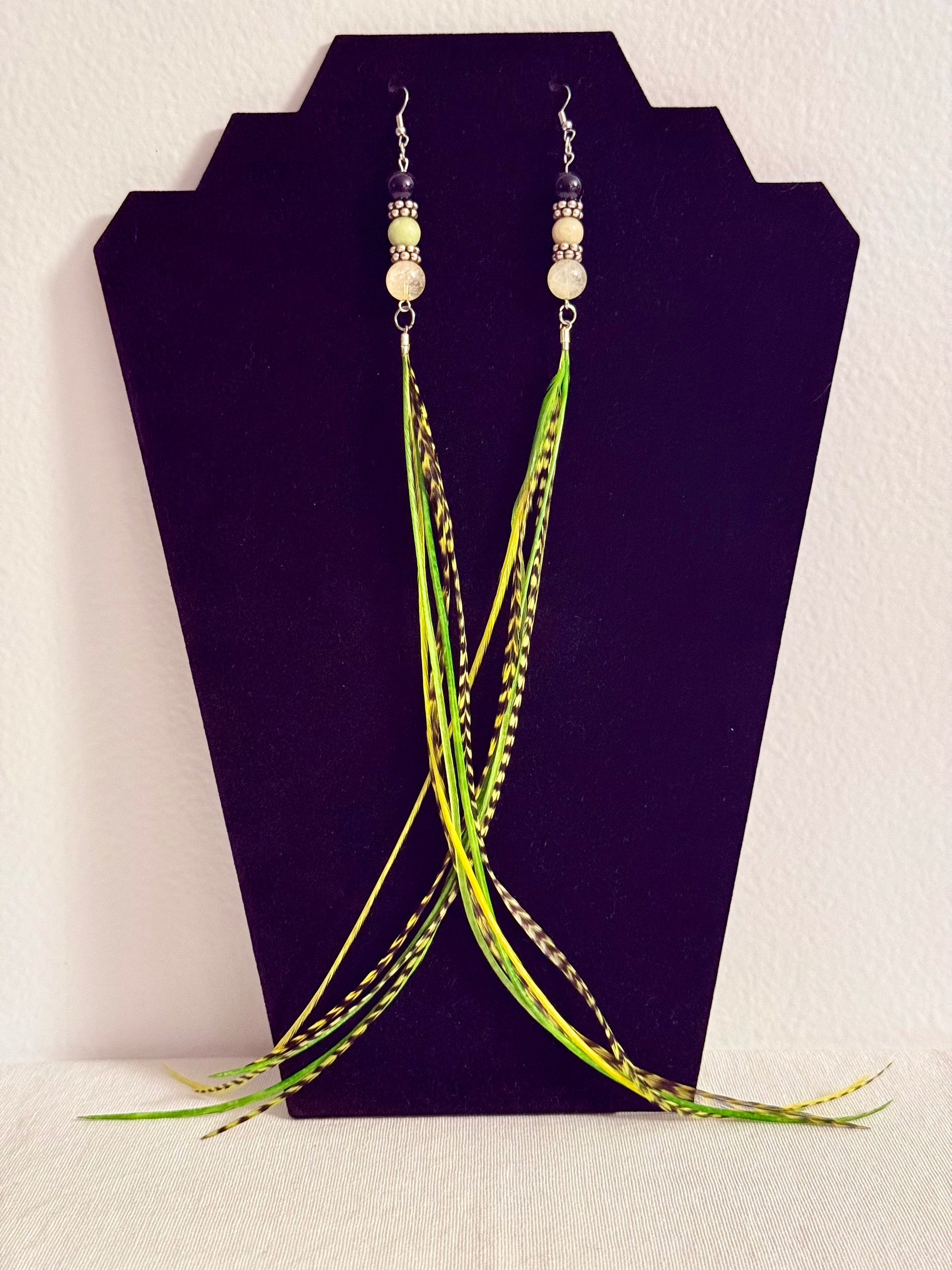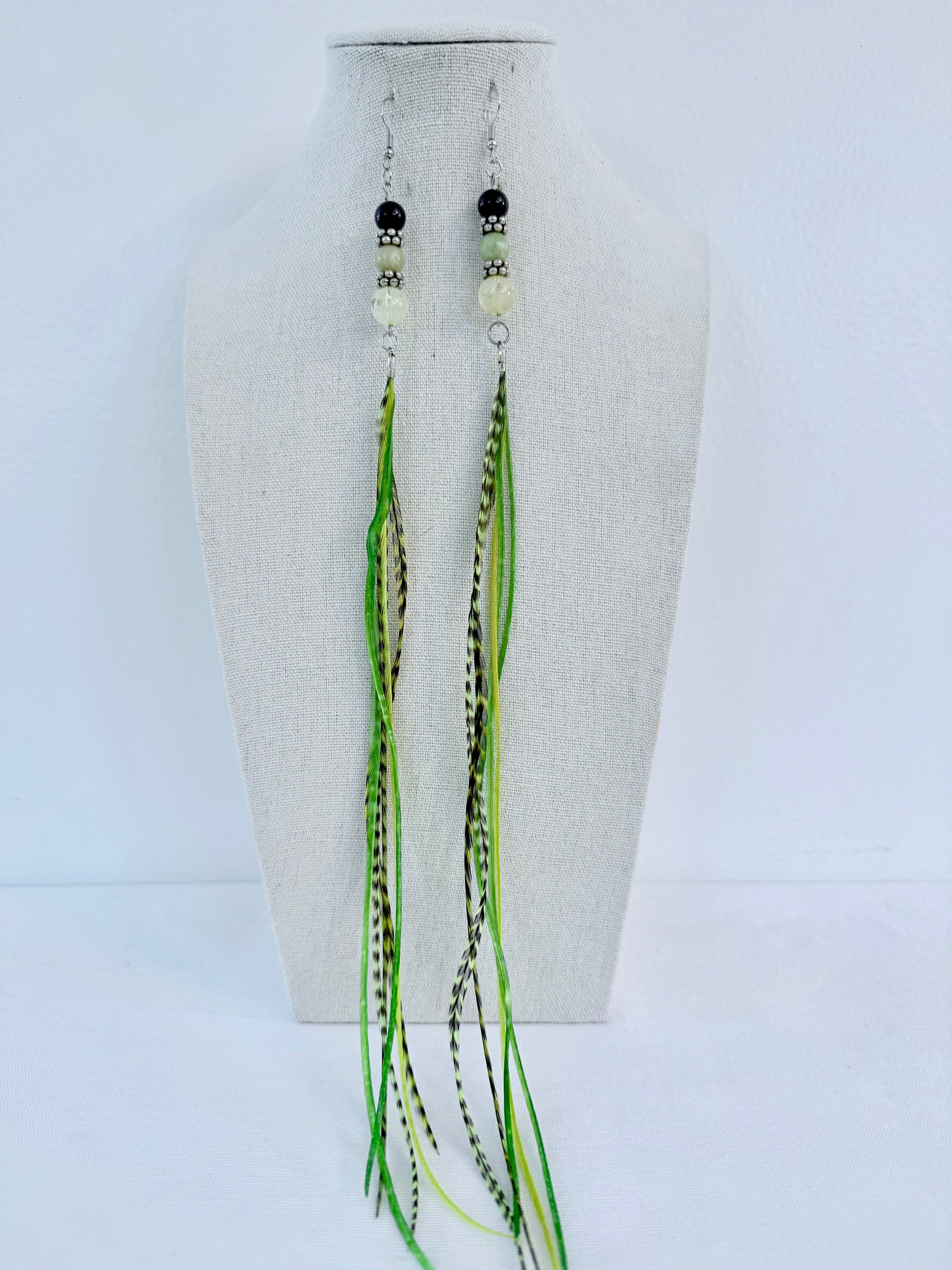 The Lemons & Limes Feather + Stones Earring Set will turn heads with lemon yellow and lime green feathers that evoke a sunny citrus grove. The feathers just brush the tops of shoulders and look beautiful blended into long hair or create a striking look on chic short hair styles. The earrings feature Black Onyx to ground and protect, while lovely China Jade and bouyant Citrine support abundance and joy.