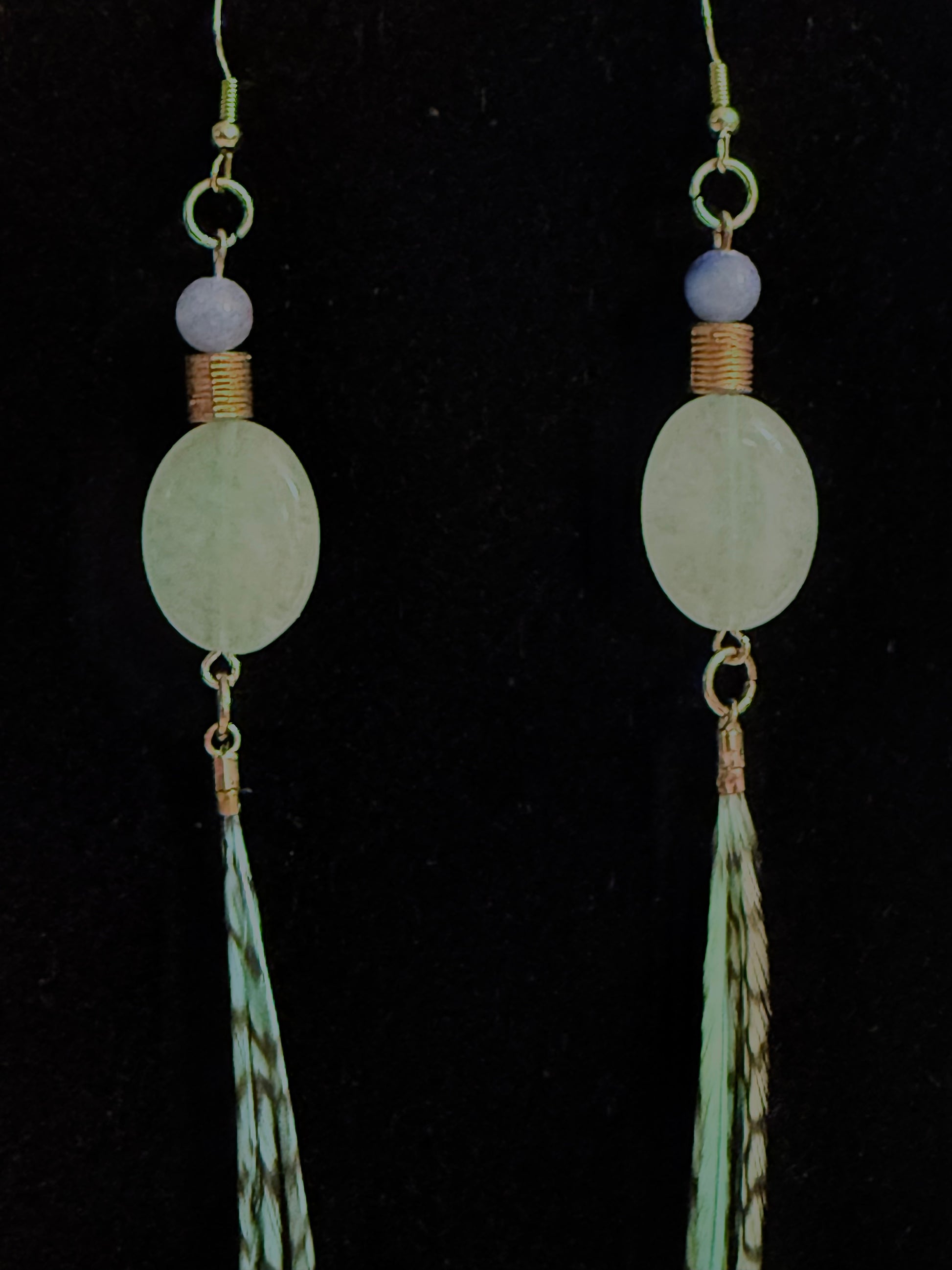 The Serene Aventurine Earring Set is made with tranquil, lake Blue Aventurine round beads and calming, mint-hued Green Aventurine ovals separated by a decorative gold cuff. Genuine rooster feathers, dyed to recall those gentle blue-greens, fall gently to shoulder length and add an airy, boho look to any outfit.