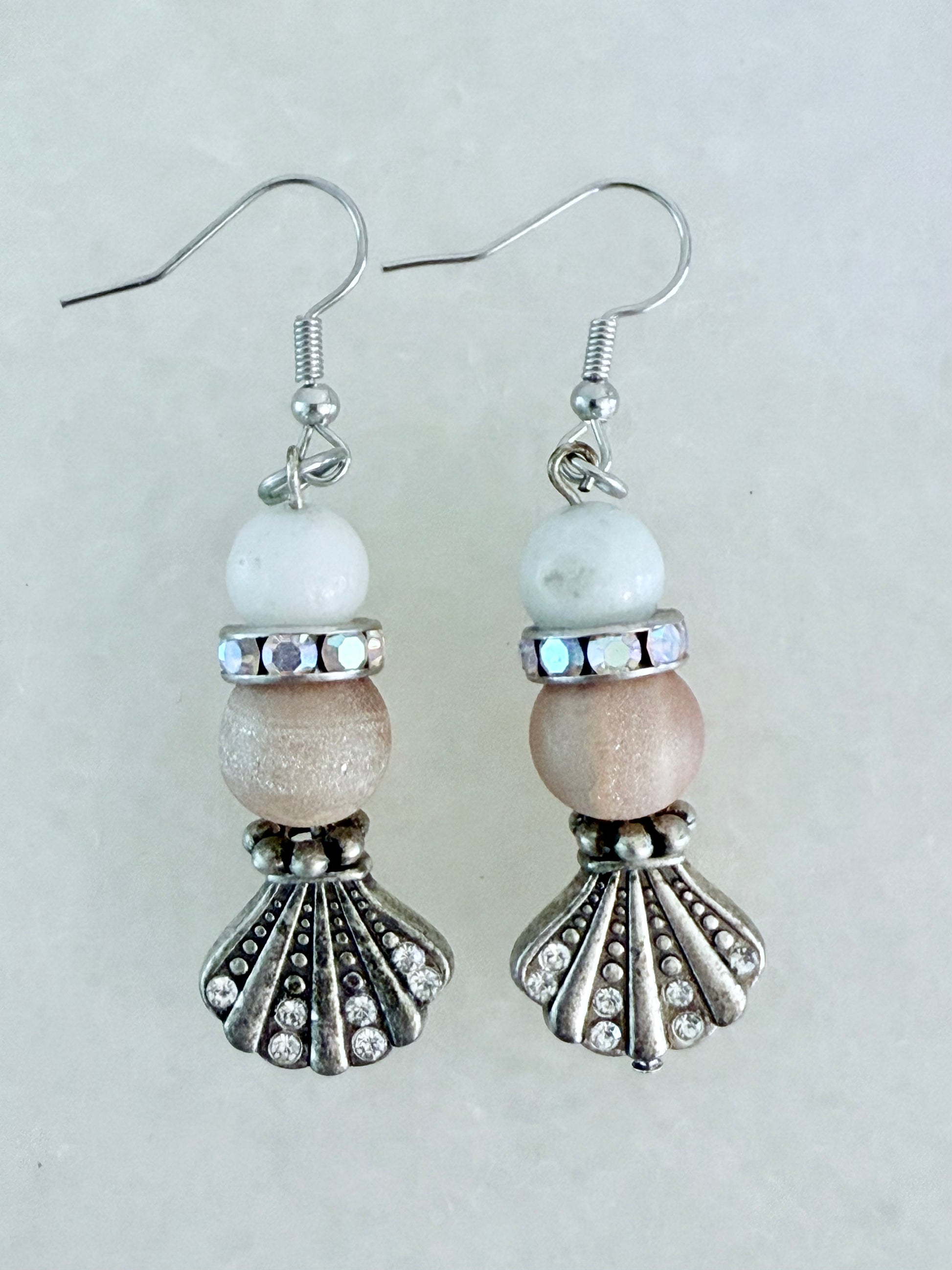 The Little Mermaid Earring set was created for the younger ladies--or ladies young at heart--with its sweet charm and femininity. Made with Druze agate in a beautiful blush hue, cream-colored Amazonite with multi-colored rhinestone rondelles and shell drops, this set makes a lovely little add-on to your Sunday best or the perfect accessory for your inner mermaid.