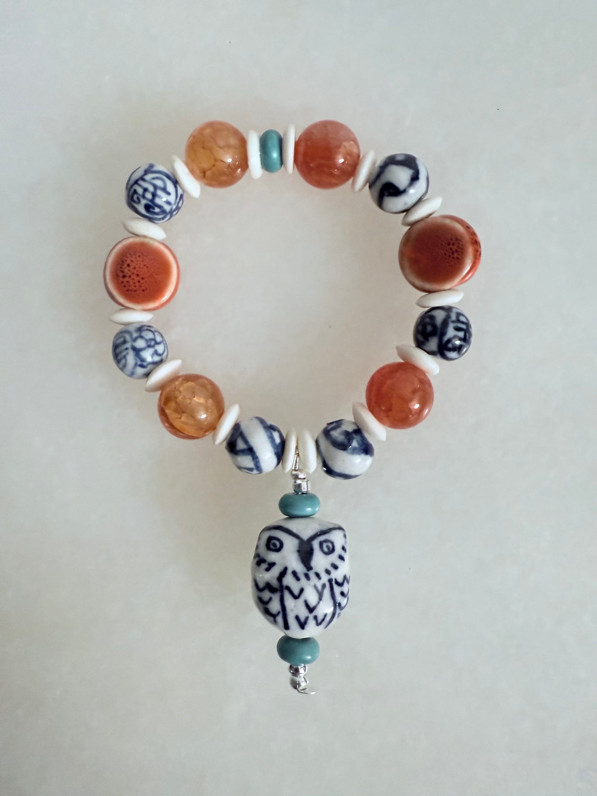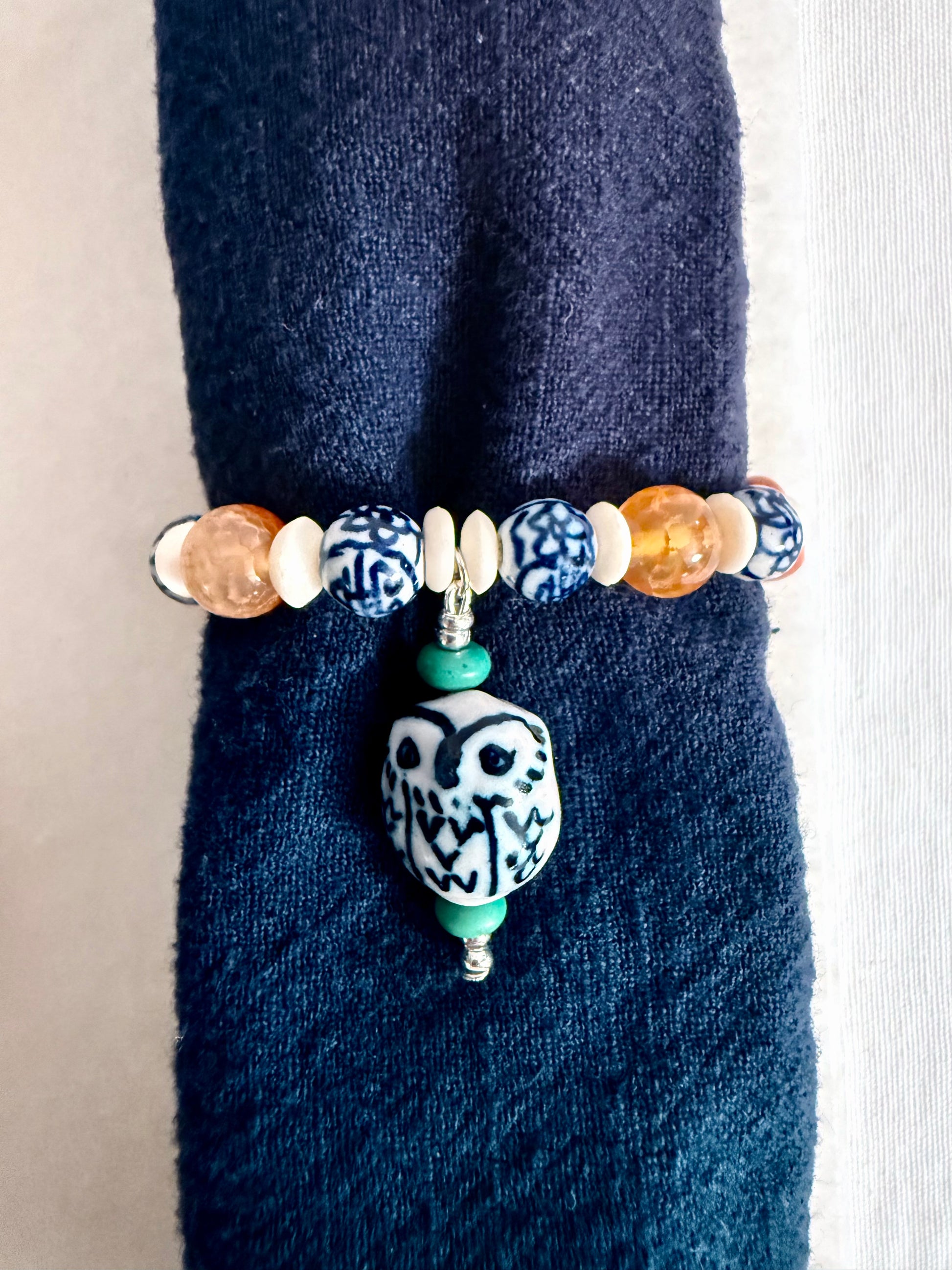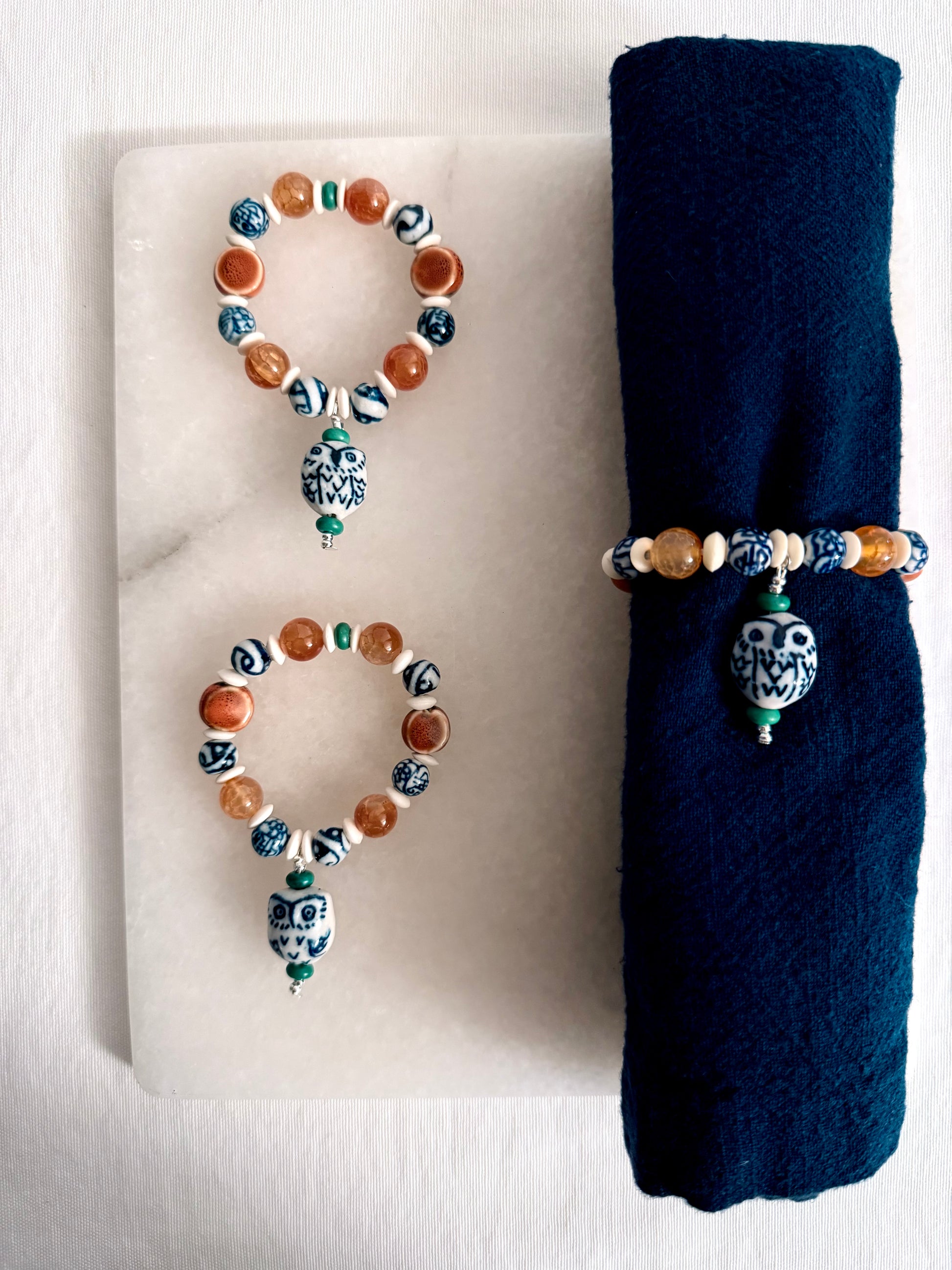 This set of six napkin rings was inspired by the folly of the March Hare's tea party Alice attended alongside the Mad Hatter, who is always full of riddles. This set of six napkin rings combines orange and blue ceramic beads, bone, teal green rondelles, and orange-dyed agate, each topped with a quaint blue and cream ceramic owl bead.