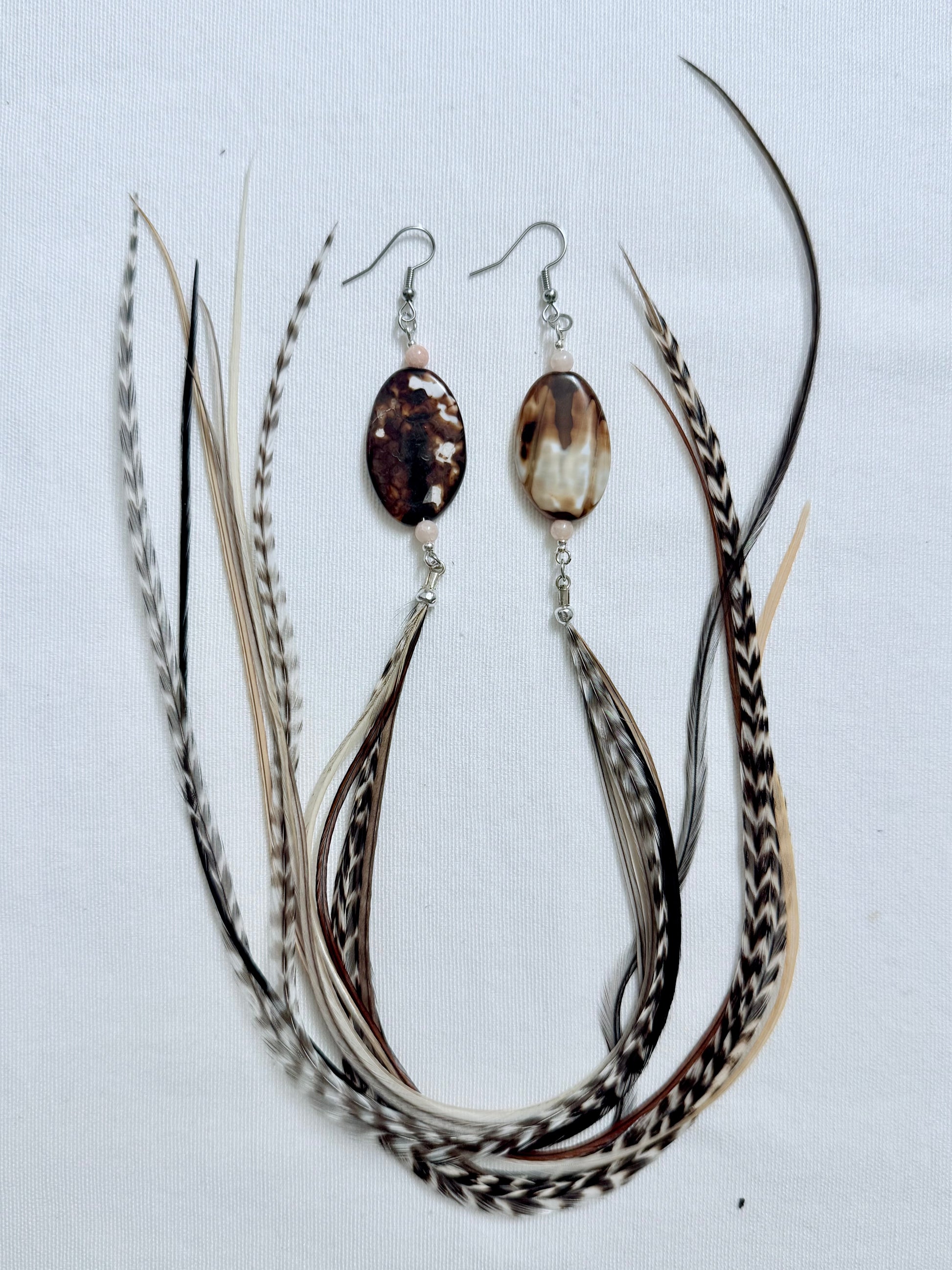 The Epona Feather & Stones Earring set is inspired by the rugged but beautiful patterns on Pinto horses and named for the Roman goddess Epona, who is often depicted riding on a horse. These earring feature oblong agate beads in rich browns, jet blacks and gentle creams framed by Pink Opals, which add a touch of feminine grace. The multi strand feathers in neutral shades add flow and movement. The feathers fall just below shoulder length and blend beautifully with long hair or create a statement with short styles.