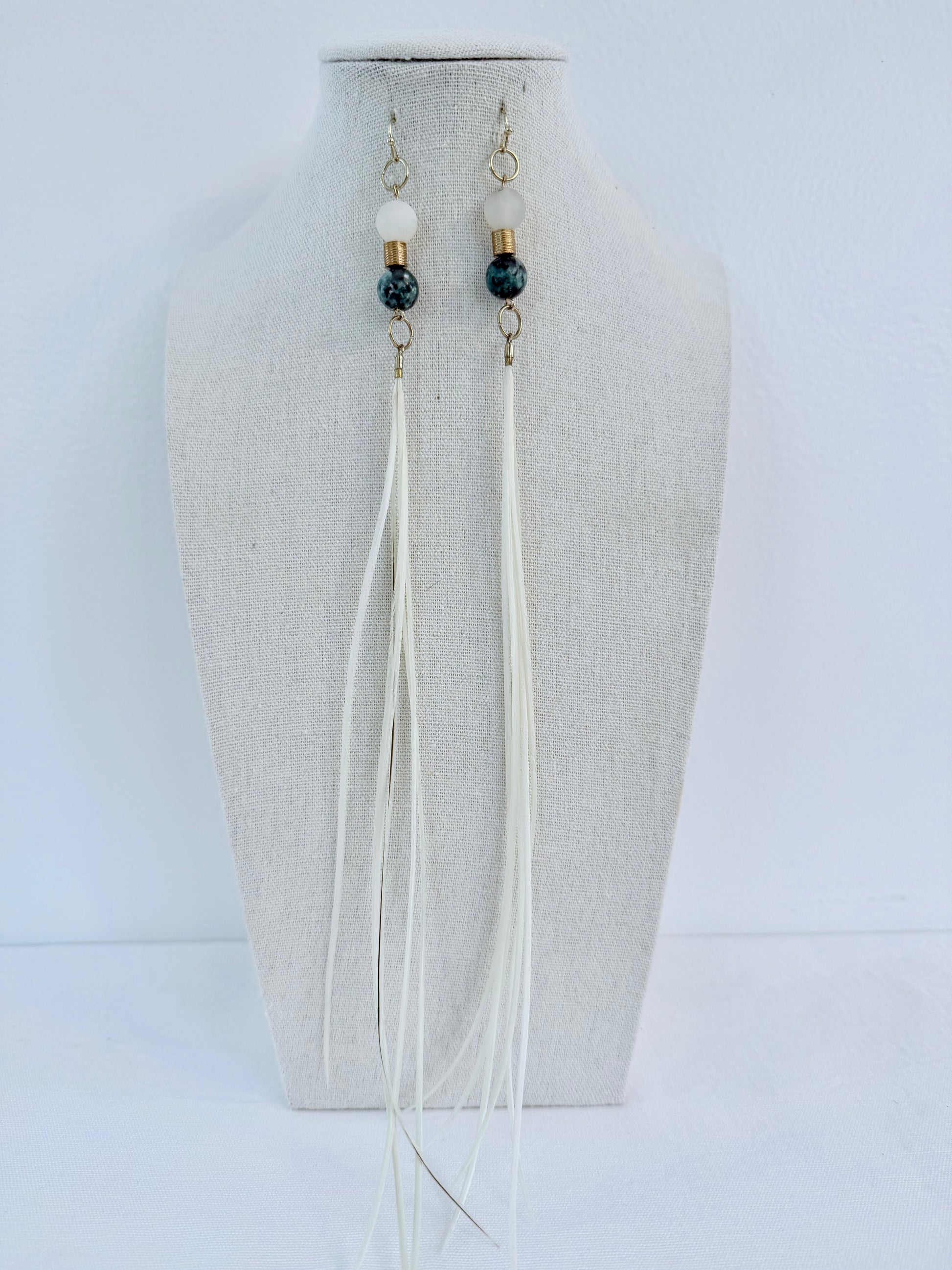 Channeling the commanding spirit of the Greek goddess, the Hera Feather & Stone Earring Set pairs genuine rooster feathers in soft ivory with stacked gemstones—African Turquoise Jasper for confidence and strength, Indian Jasper for grounding stability, and Marine Chalcedony for compassion. Each earring features a delicate gold cuff that anchors the design with understated elegance. These statement pieces celebrate the multifaceted woman: bold yet nurturing, powerful yet graceful. Perfect for the matriarch who commands a room or as a meaningful gift for someone who embodies both beauty and resilience.