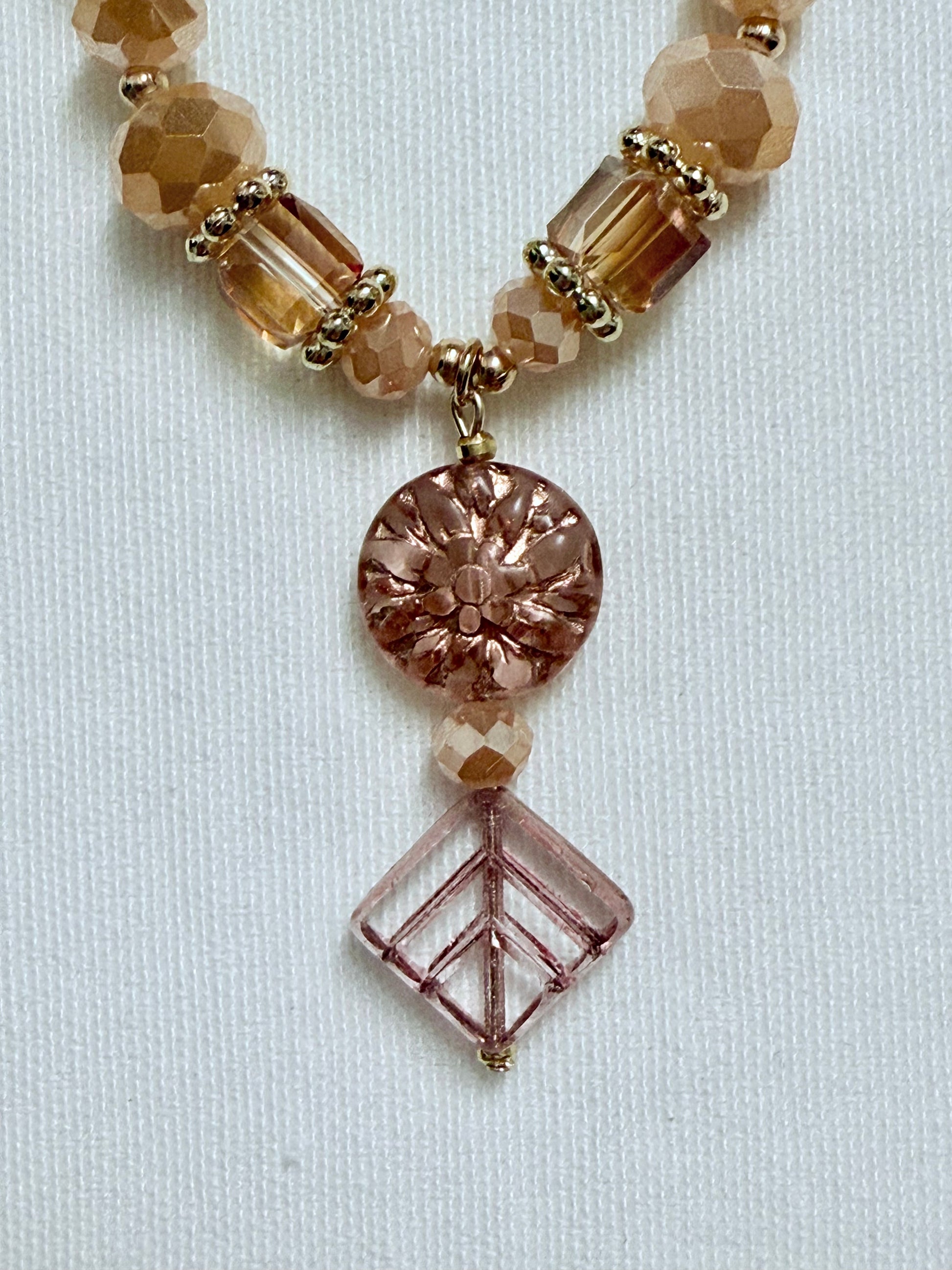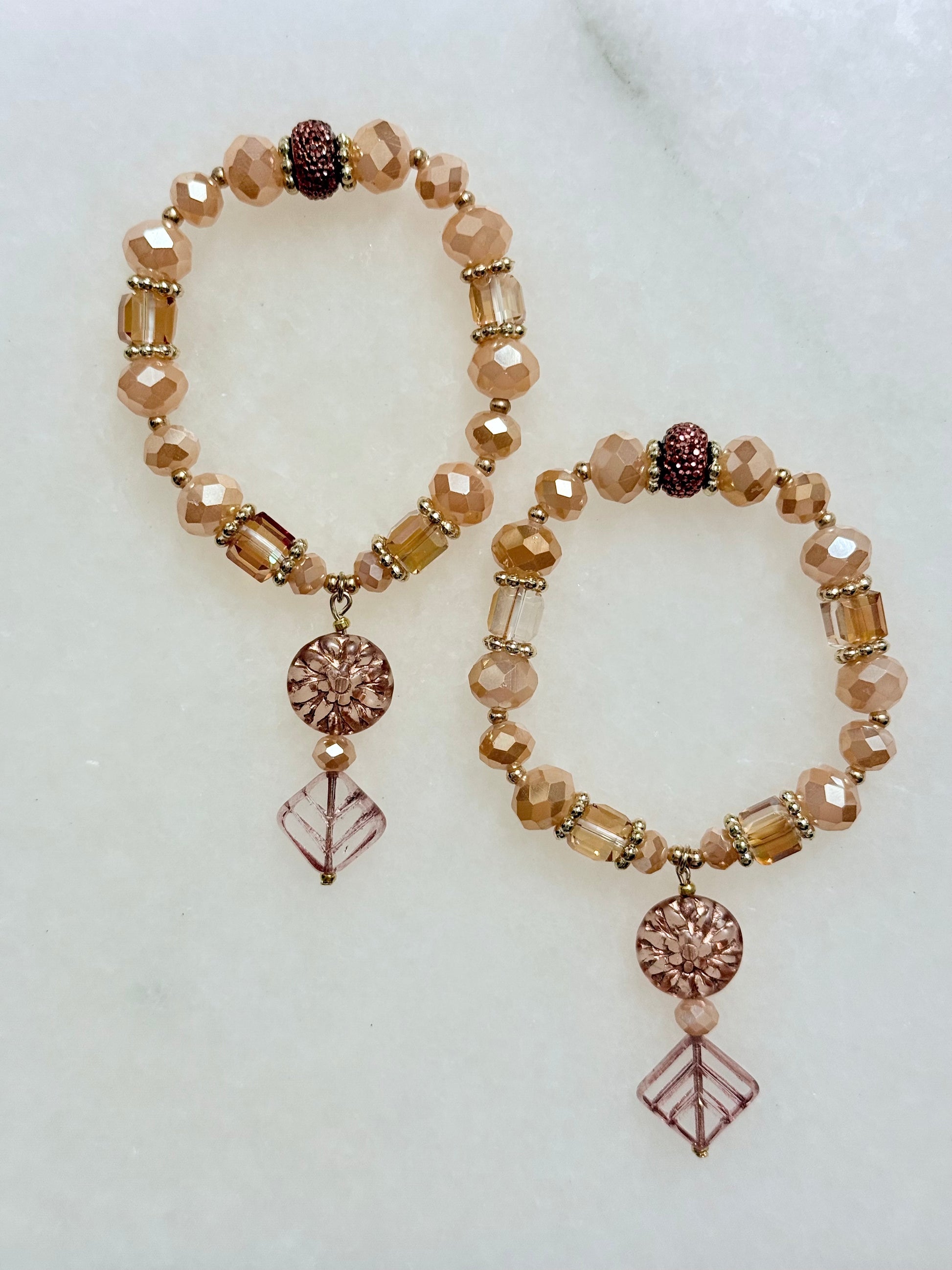 The Matilda Napkin Ring Set draws its name from Roald Dahl’s beloved children’s book Matilda and the famed chocolate cake featured within its pages. Crafted with faceted glass beads in a champagne hue and square Czech glass beads, the set shimmers in shades of gold and soft blush pink. Each charm, made of Czech glass, includes a floral etched bead, a delicate faceted glass bead, and a geometric Czech glass piece with line detailing.