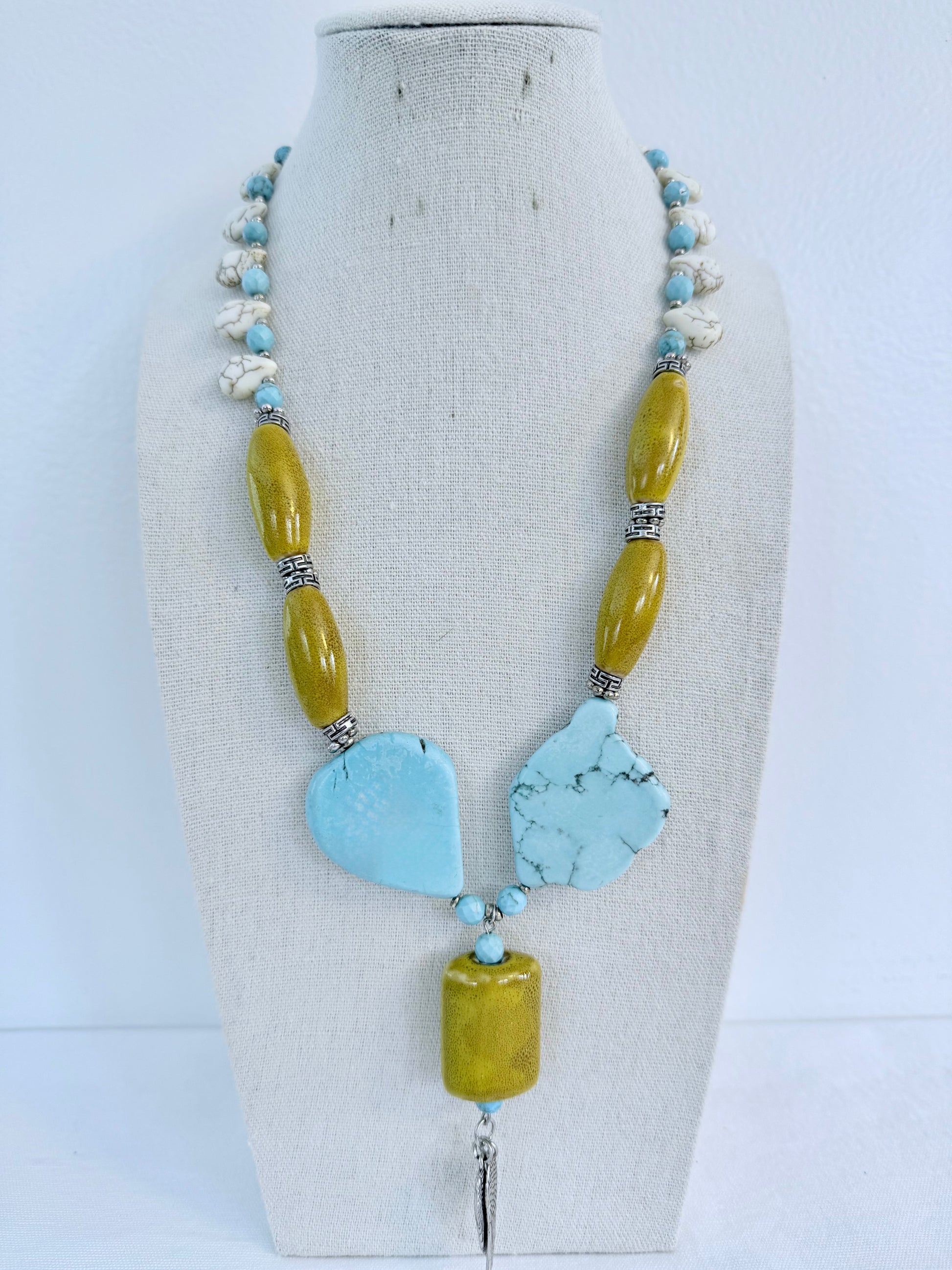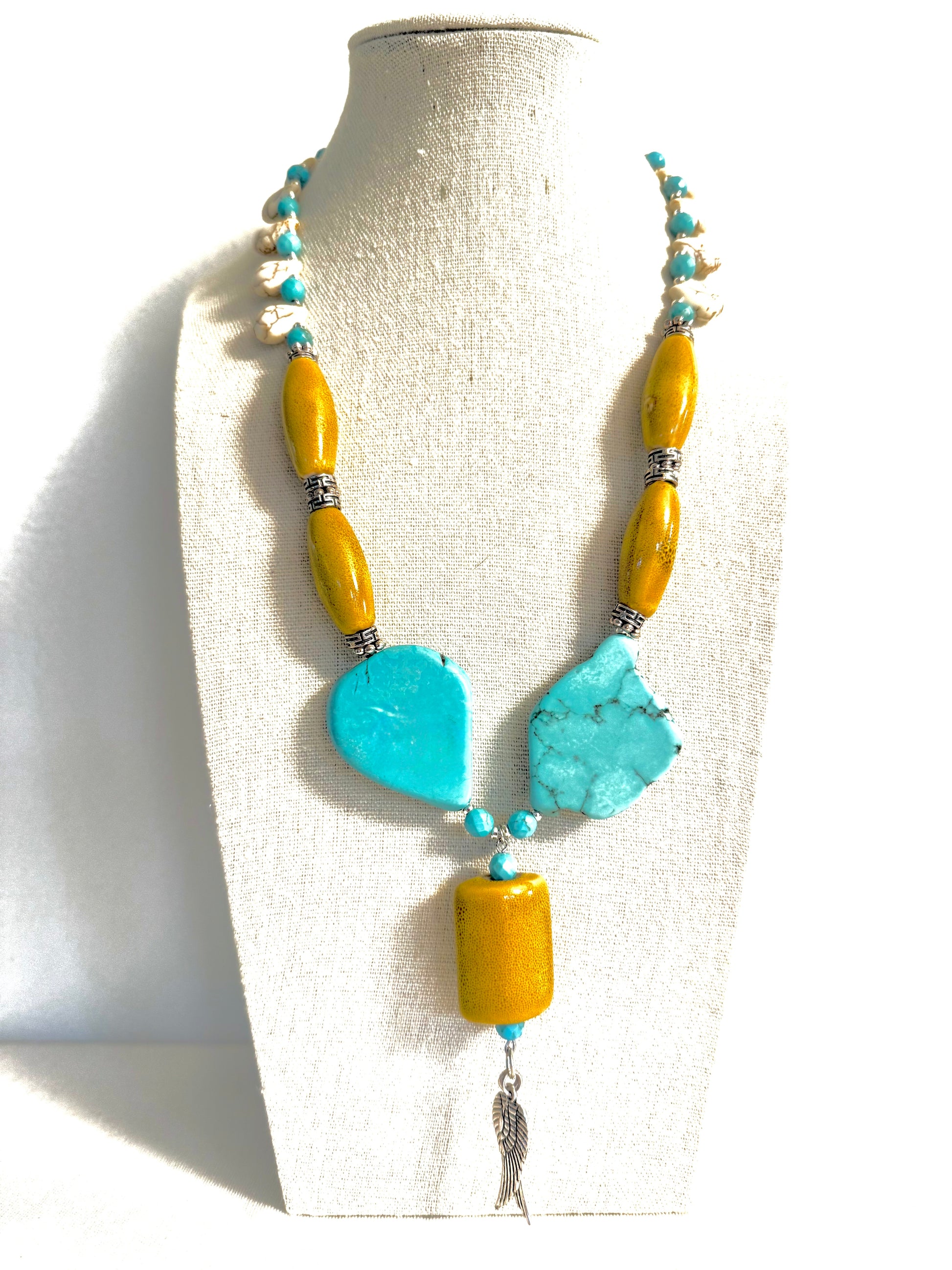 The Sacagawea is made with two slabs of turquoise with smaller, faceted turquoise beads toward the back, alongside Howlite teardrops and earthy, mustard colored ceramic tube beads and pendant. The pendant has two turquoise beads and FreeBird's signature feather embellishments, which also appear at the neck.