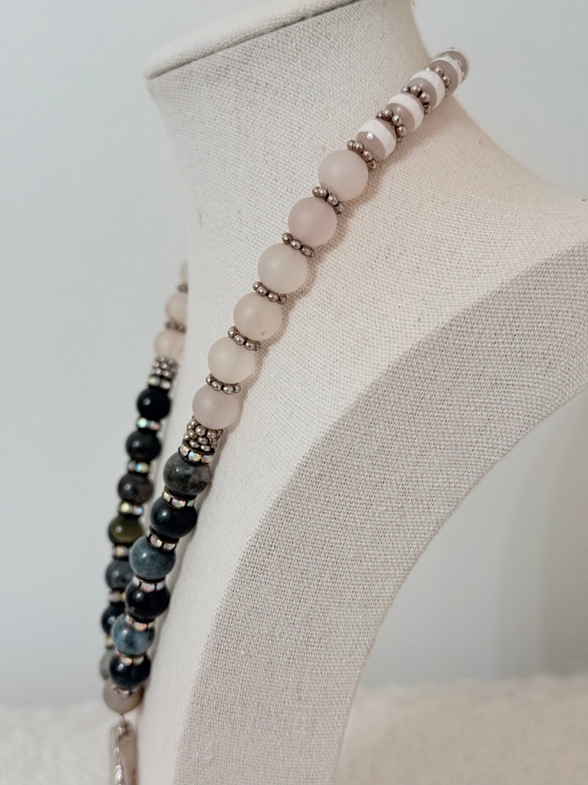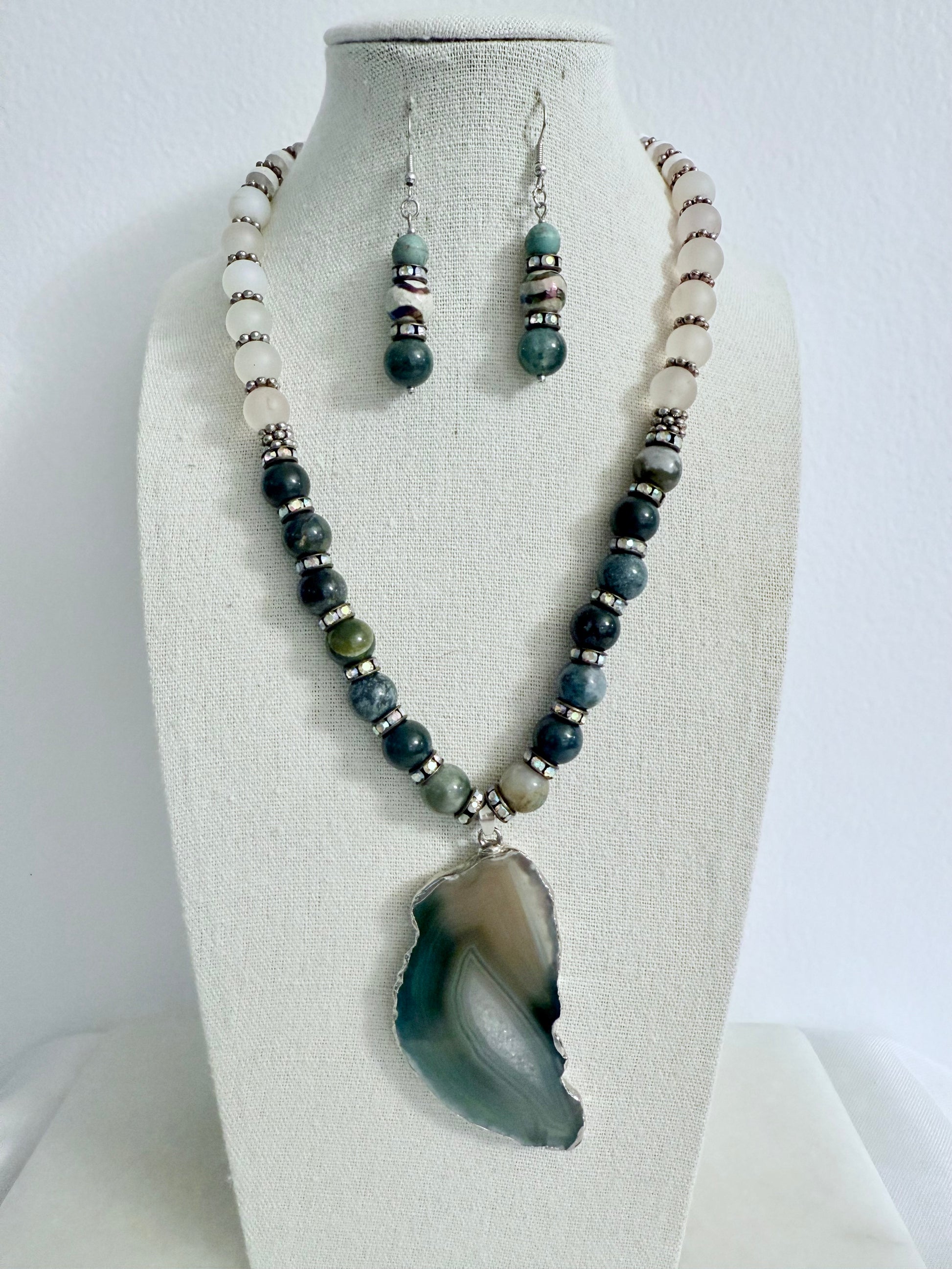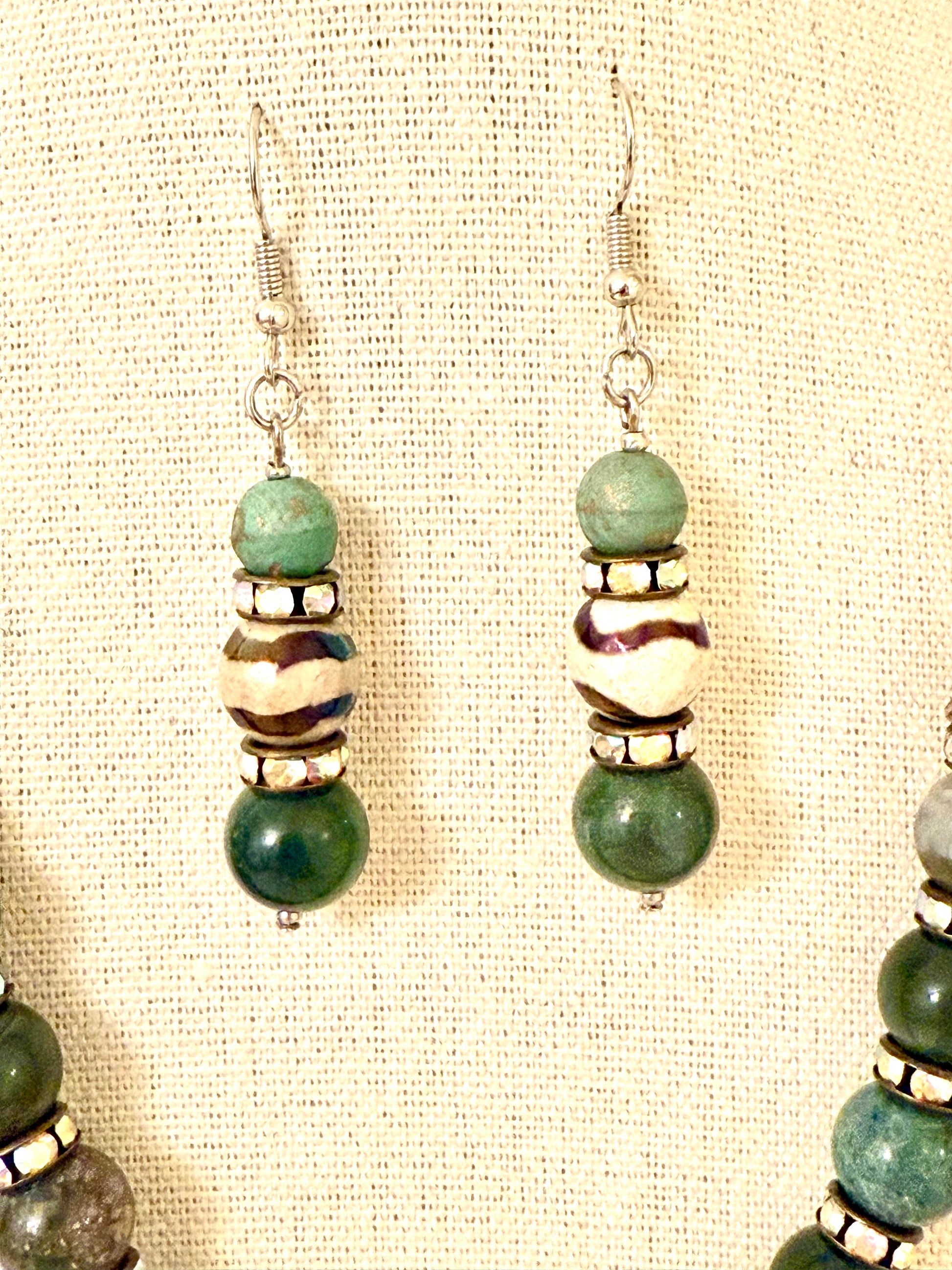 The Verdantia pendant set is inspired by the Green Mother goddess Verdantia, who is depicted as a figure with emerald flowing hair and embodies fertility, vitality and abundance. Recalling her emerald green hair and fecundity, this set both soothes and stuns beginning with a river Agate pendant in lush greens evocative of the Northern Lights and beautifully striated. The necklace is made from jungle-green Indian Jasper round beads, providing grounding properties, while milky white Marine Chalcedony round beads amplify mental clarity. The necklace is finished in back with hand-painted banded agates with silver accents and subtle rhinestone rondelle beads. The earrings feature Indian Jasper and hand-painted agate beads with slight color variations for visual interest.